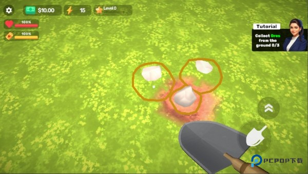4、站在目标区域点一点挖宝按钮,神奇的铁铲就会翻土,地下的矿石和好东西就露出来了。