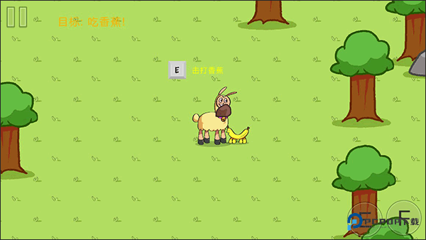 用刚才找到的石头去砸那只香蕉狗,让它昏过去(或者把它赶跑也行),这样才能放心地捡起掉落的香蕉吃掉。
