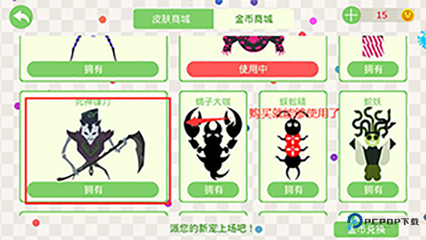 2. 浏览皮肤区选择蜘蛛类皮肤,用金币购买或用活动积分兑换。瞬间化身蜘蛛在战场穿梭!