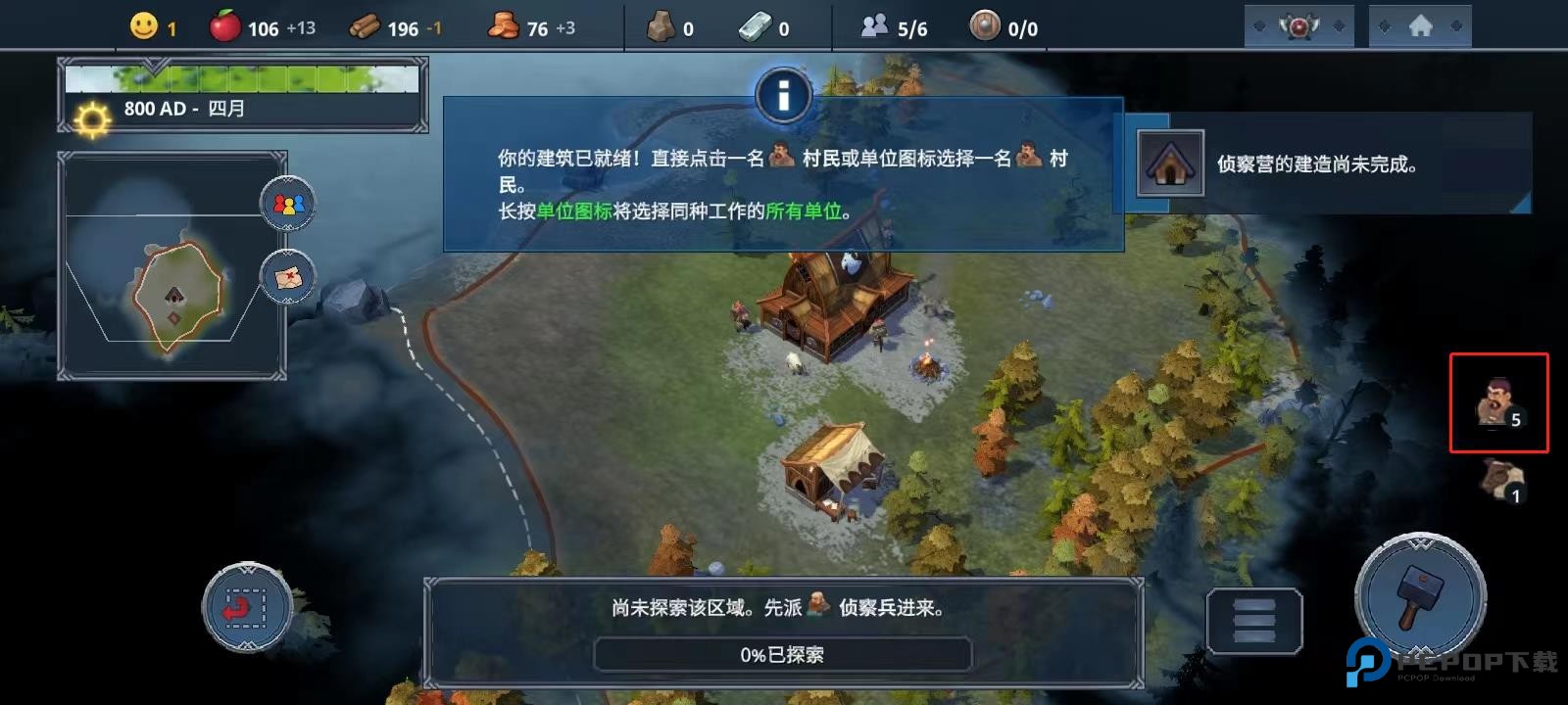 7、建筑一旦落成,村民就能干活了!方法很简单:要么直接点击地图上的村民,或者点右下角的村民图标也行,按住某个工种图标不放?嗯,这就能选中所有干这个活的人了;