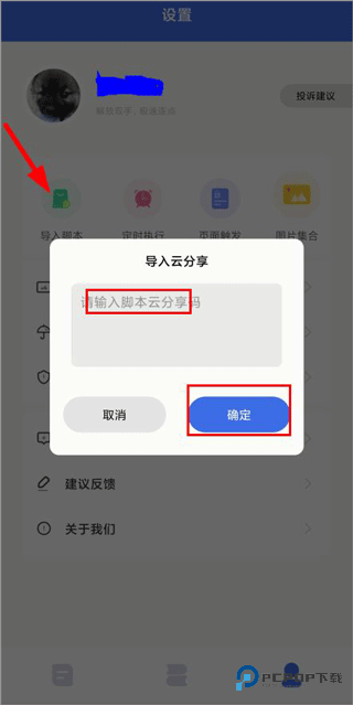 3、认证完成后,回到 "我的" 页面,找到 "导入脚本" 选项,输入别人分享的脚本分享码就能使用了。