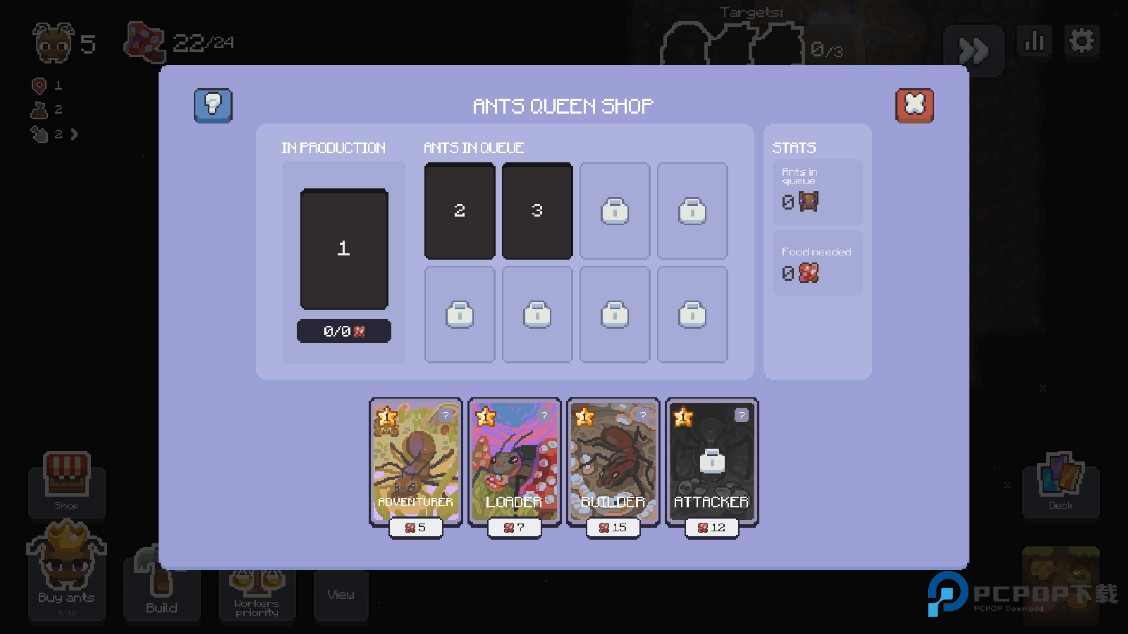 1.点左下角的生产蚂蚁按钮就能获得各种能力不同的蚂蚁。