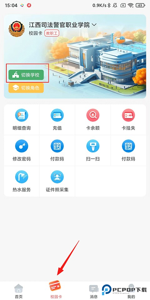 1、打开易校园App,点击【校园卡】-【切换学校】;