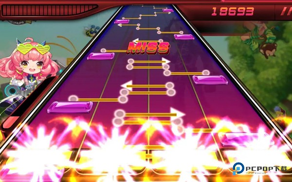5、遇到单滑键音符注意看箭头方向!手指顺着那个音符箭头的指向,在屏幕上滑动一下把它送走。