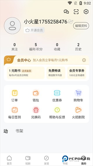 显示个人账号信息,有【订单】【钱包】等功能,可进入会员中心查看权益