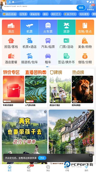 用户点击首页,在首页可以进行酒店、机票、火车票预定等操作,也可以查看平台用户分享的攻略。