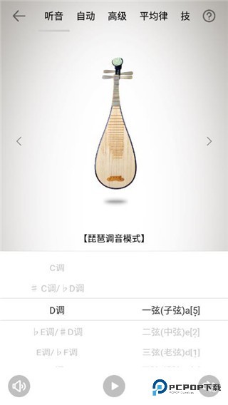 2、调音器,提供:听音模式、自动定弦、高级调音、十二平均律校音、琵琶技法,共5种调音模式;