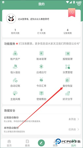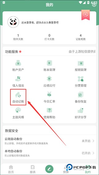 2、在“我的”页面中你可以看到账本管理、报销管理、分类管理、备份恢复等各种实用功能,选择“自动记账”功能进入;