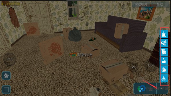 2、成功进入房间,点击右下角的这个图标可以使用道具来打扫垃圾;