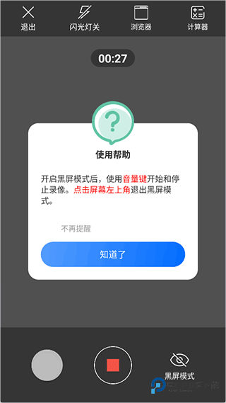 4、录像取证同样拥有黑屏模式,且操作便捷:在黑屏状态下,使用手机的音量键就能控制开始和结束录像。需要退出该模式时,只需点按一下假黑屏画面左上角的小退出标记即可。