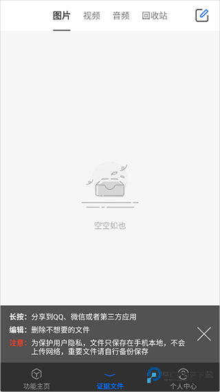 5、所有通过本应用拍摄的视频文件、图片证据以及录音文件,均统一存储在应用内部的 “证据文件” 管理区,用户可随时在此集中查看、管理取证成果。