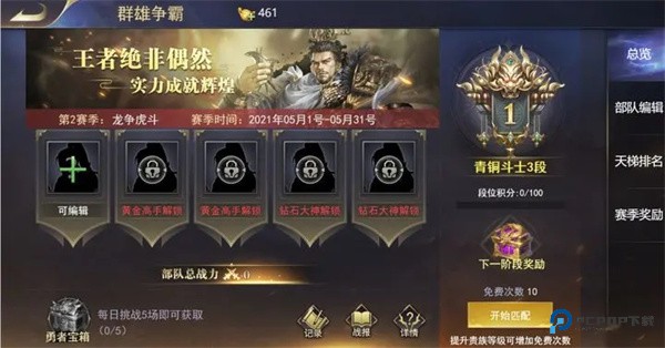 当累积的积分达到要求,你的段位自然就会提升。提升段位不光能领段位奖励,更重要的是能解锁更多的出战部队位子!这时对手实力普遍提升,田忌赛马(用弱队消耗对方强队,用强队打对方弱队)的策略就变得非常关键了。