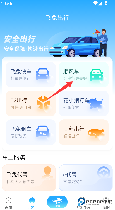 2、选择“顺风车”功能并点击进入车辆匹配界面。
