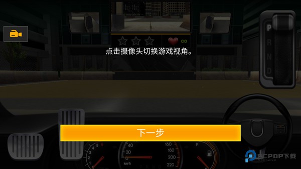 4、左从左到右边依次为刹车、油门,方向盘,左上方可以切换视角,右上方为档位,根据你的习惯来调整汽车倒车入库的位置,合理的把握汽车的方向,不要发生碰撞,将车以最佳位置倒入库中。