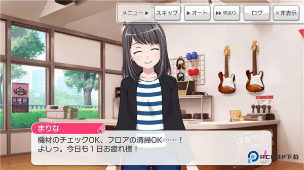 下载完毕后会有一小段剧情,内容是Poppin'Party各成员的自我介绍,右上角的「メニュー(菜单)」按钮点下去后会有「スキップ(跳过)」、「オート(自动)」、「早送り(快进)」、「ログ(记录)」和「非表示(隐藏UI)」五个选项,就和其他的视觉小说类游戏一样。