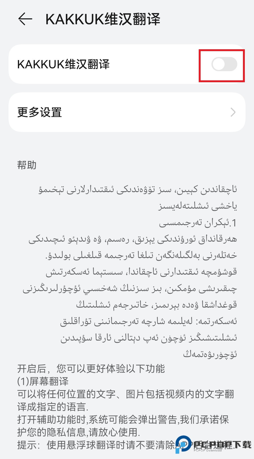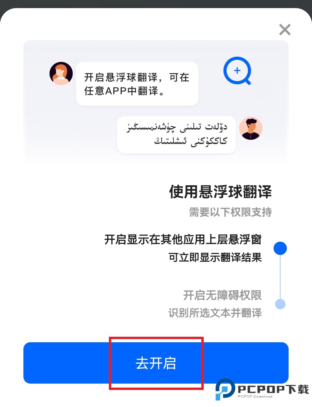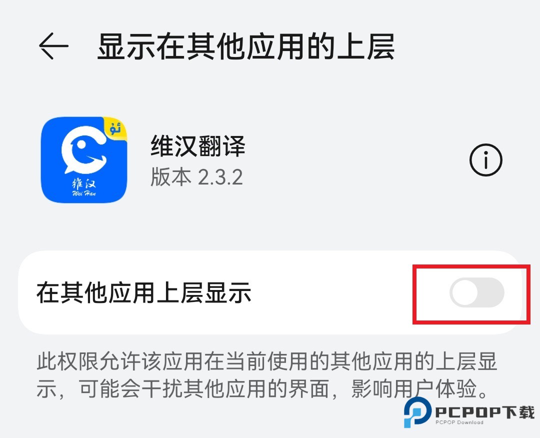 2、根据提示点击"去开启",找到维汉翻译,开启"显示在其他应用上层悬浮窗"权限。