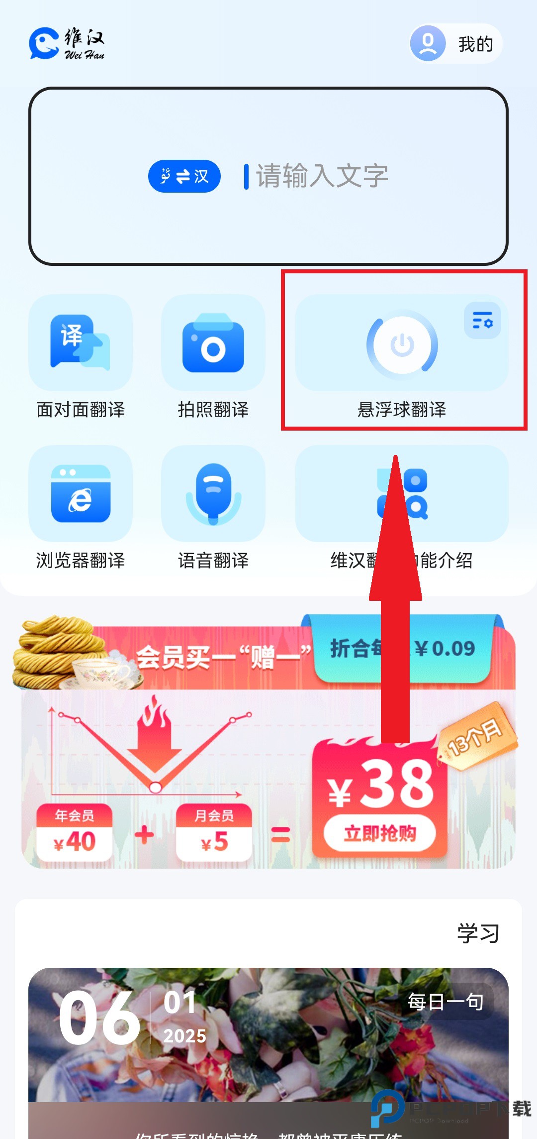 1、打开维汉翻译app,点击悬浮球翻译。