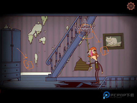 12、荡过二楼缺口:宅邸二楼,用刚得手的藤条加上盖文助力荡过木板缺口(藤条用完消失)。继续上楼,到阁楼顺手拿走风景画。箱子需要密码开锁?聪明点下楼去。
