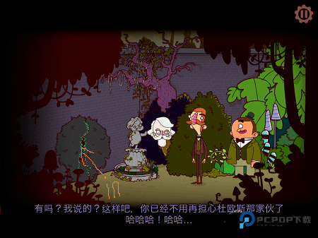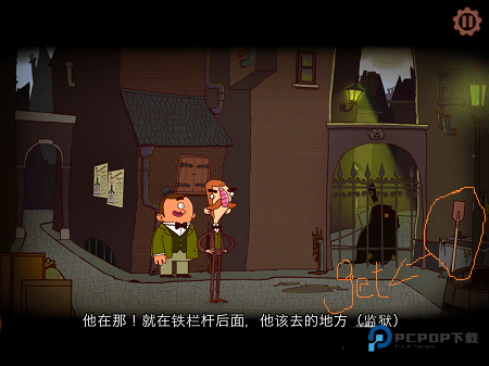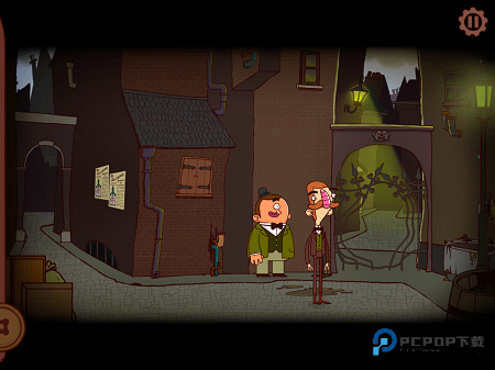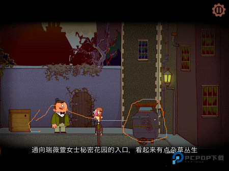 小巷那头有条挂着绳子的巨大内裤,哈,用铁锹把它勾下来装入口袋。接着扶起跌倒的老爷爷(游戏里不怕碰瓷~),他会给个破损眼镜片,信不信由你。最后敲敲门打探富马克伯爵的情报,收到消息就往右移动进新区域。