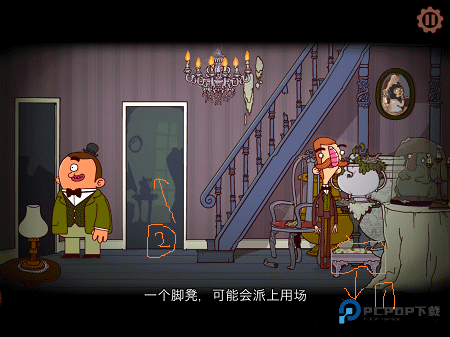 5、屋内初步探索:进门直接拿到靠屏幕右边的脚凳,轻松简单。再走近楼梯旁边的房间,展开下一步调查。