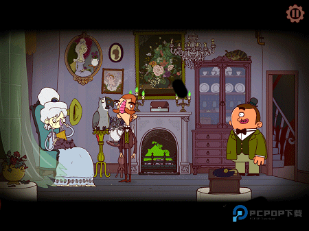 6、室内收集关键品:在这个房间,拿起留声机上的喇叭,递给椅子上的女士,让她能听清说话(游戏式 “助人为乐”)。顺手拿走壁炉盒中的钻石哦。和乌鸦聊天发现它饿了,需要投喂才开口,暂时没吃的?那就乖乖出门准备。