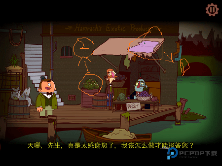 18、深入后遇到富马克伯爵,喂他从水果摊得到的食物换取线索和小刀。
