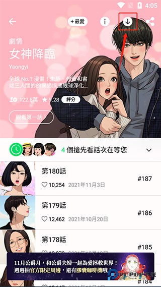 6、点亮下载小图标:在漫画详情页的最顶部导航栏找一找 “下载” 图标(长得像个向下的箭头),发现了吧?点它!