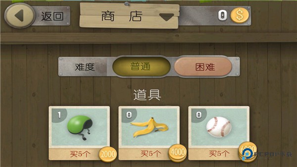 9、商店使用金币购买 磁铁吸附器 / 超级弹跳鞋 等道具对抗小偷,难度设置分 简单 / 标准 / 困难 三档自由切换。