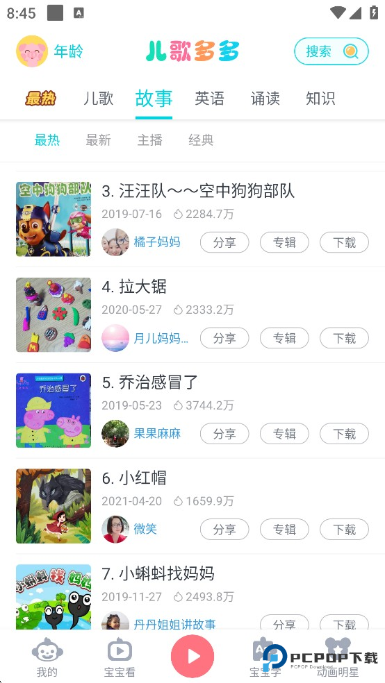 儿歌多多收录整理了海量宝宝爱看的绘本、热门动画,火热的小猪佩奇、汪汪队、海底小纵队、宝贝佑佑、百变布鲁可、虹猫蓝兔、超级飞侠、萌鸡小队、爱探险的朵拉、喜羊羊等……超多宝宝们喜爱的动漫明星都在这里等你一起玩耍哟~