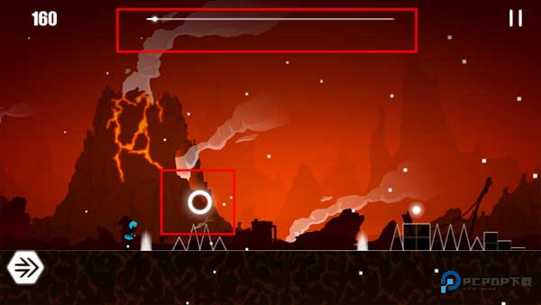 4、除了这些功能键之外,小编还介绍一下左下角的双箭头按钮,它可以让角色在一段时间内不受到尖刺等陷阱的伤害。玩家在跑酷的过程中需要触碰会发光的圆圈来收集上方的光源,让它的进度条满格。