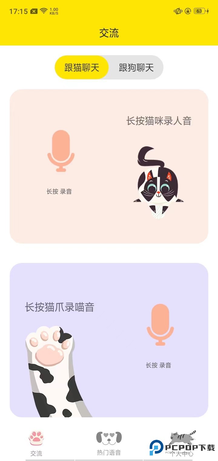 2、点击下方导航栏中的【热门语音】,就会出现撩猫专区和撩狗专区;
