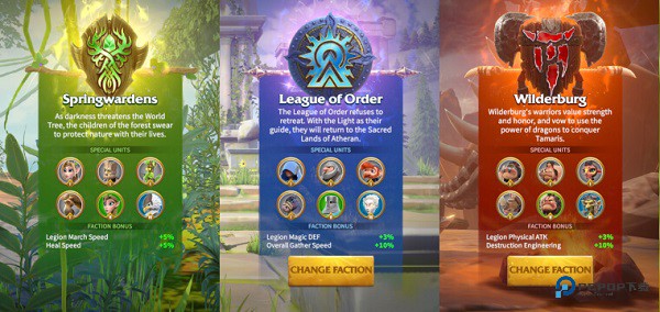 开启游戏第一步开始,在秩序联盟(人类)、春境守护者(精灵)、蛮荒城塞(兽人)三大派系里挑一个。每个种族带着专属兵种、建筑风格、特殊能力和限定英雄。确定派系后就能建城池、采资源、练军队,既能单打独斗也能结盟出征。