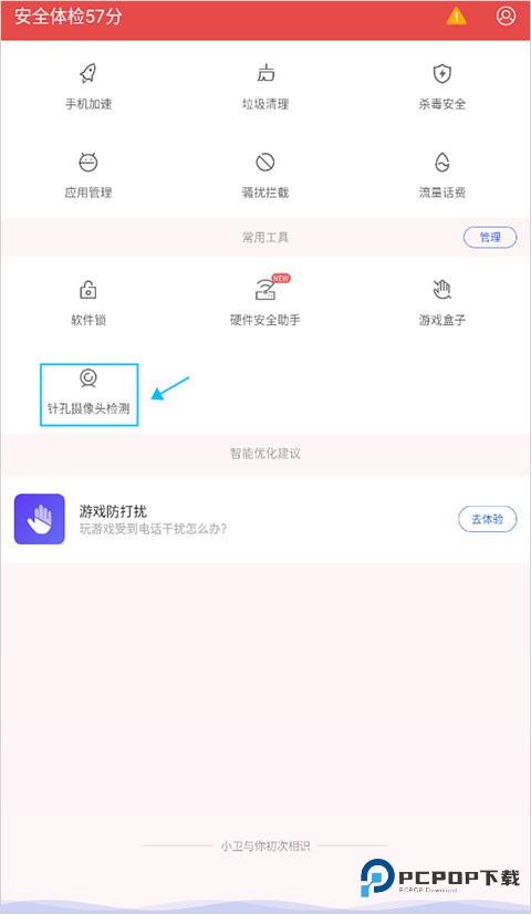 1、使用百度手机卫士首页,直接点选 “针孔摄像头检测” 这个特色功能。