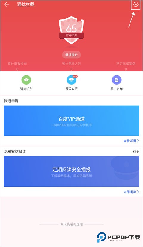 1、打开百度手机卫士应用,直接在主页面找到 “骚扰拦截” 选项并点击进入,哦,接下来选择里面的 “设置” 功能哦。