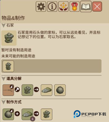 道具分解中出现的手掌图标,意思是人物需要手持状态下再和石冢交互。箭头右边的两个物品就是石冢分解之后产生的原材料。最下方的制作方式里手掌图标,同样是需要人物手持原石和6个重叠的石块进行交互,制作而成。