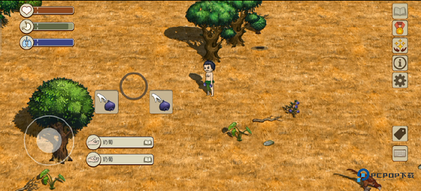 打开右下角标签功能,部分动植物的名称就会显示。名称的背景有灰色和紫色两种。灰色背景道具为一般的道具,可以捡起手持;紫色背景的道具交互后会产生新的道具,如有果实的果树、有蛋的鸟巢都是紫色背景可交互,交互完成后可以得到能食用的果实和蛋。