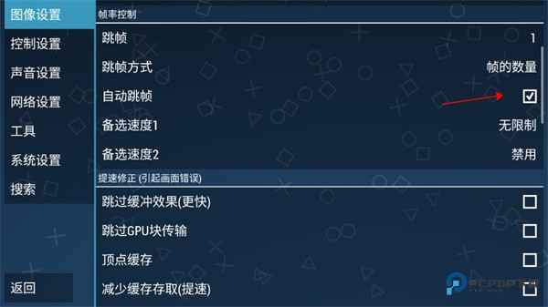2、跳帧选择。选择自动跳帧,这可以帮你减少卡顿感。