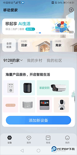 1、登录移动爱家 App,在‘设备’管理界面找到并点击【添加新设备】选项。