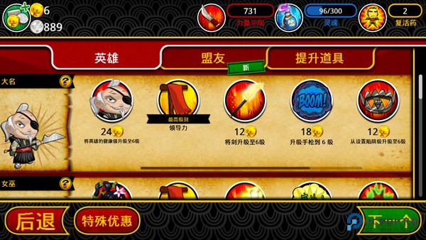7、升级你的武士英雄,通过获得更好的武器、防御工事和魔法能力,变得更加强大。