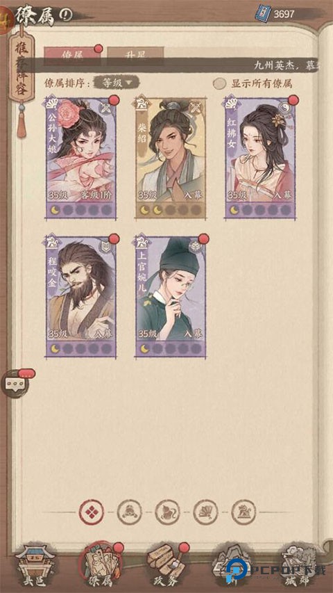 3、首先我们对僚属进行升级,每次升级需要消耗一定数量的蓝品