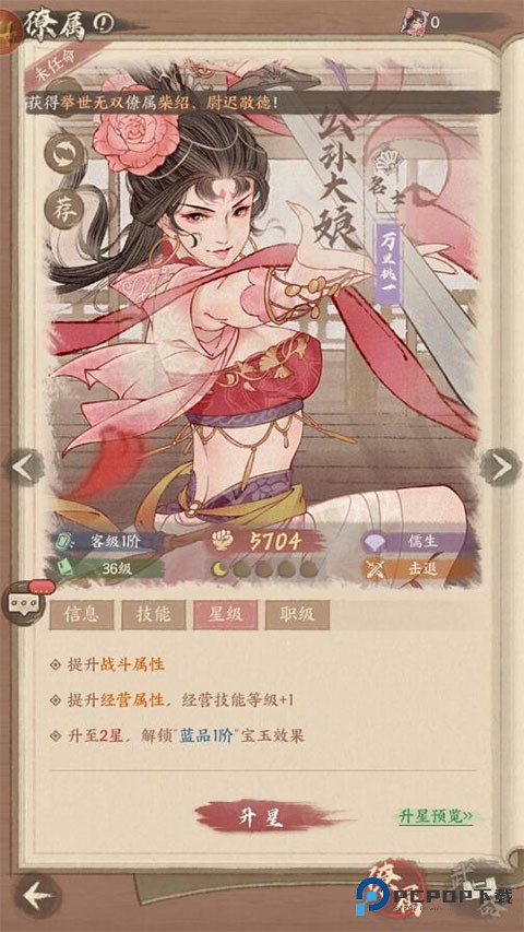 4、提升等级后点击星级进行升星,升星后可以解锁相应的技能效果,还可以提升战斗和经营属性