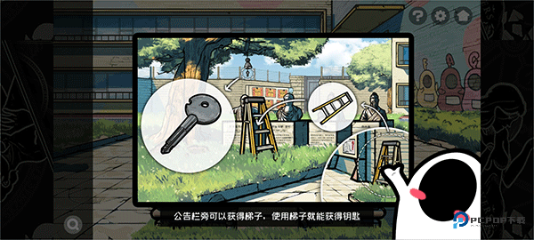 1、在公告栏可以获得梯子,使用梯子就能获得钥匙