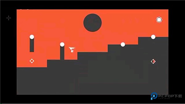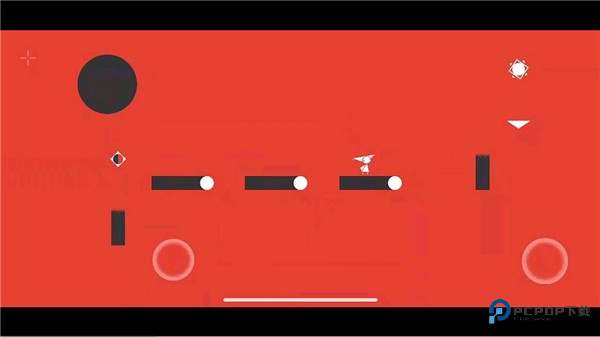 初始教学关卡,本关中的背景一分为二,大家需要关注好上半部分的颜色变化,上半部分背景为黑色,此时跳跃站立的柱子为红色,则代表可以站立;再次跳跃后上半部分背景变为红色,此时跳跃站立的柱子变为黑色,黑色柱子就可以站立了。大家可以根据这一特性初步了解下整体的游戏玩法。