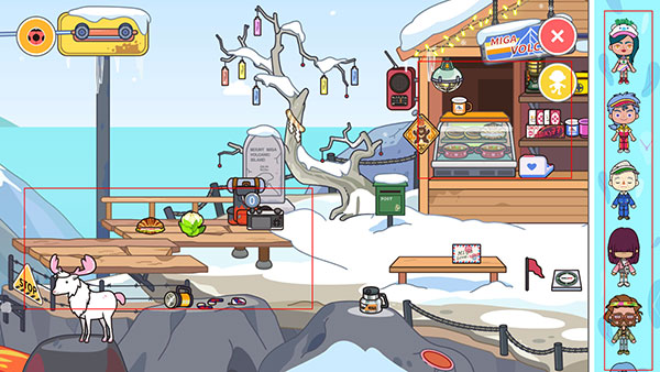 3、点击右上角第一个头像,可以添加表情,点击第二个头像可以挑选人物放置在商店雪地;