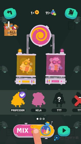 当闯完关后进入选择关卡的时候点击屏幕右上角的角色键,进入后你可以看到黄粉两个机器,只需要把屏幕下方的允许合成的两个人物拖动到上方的机器中点击MIX键就可以合成出新的人物了。
