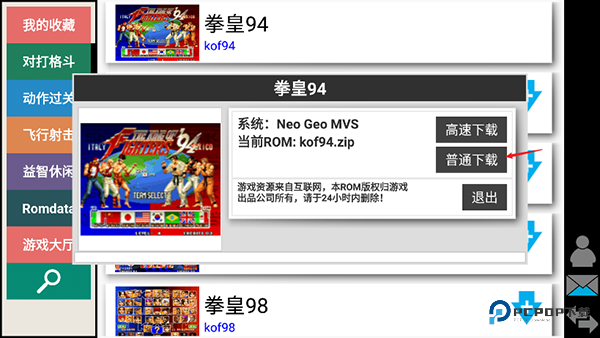 1、下载安装街机模拟器kawaks安卓版,运行后如下图所示,包含了对打格斗、动作过关、飞行射击、益智休闲等;
