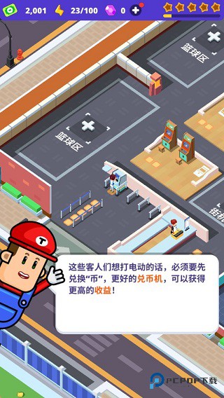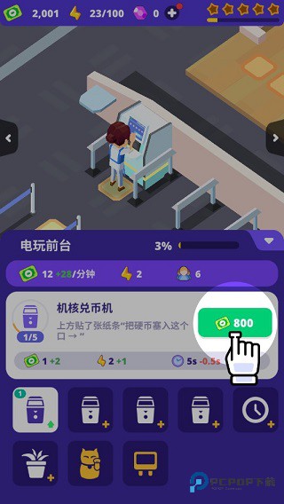 1、兑换币起步:客人们想玩电玩时,必须先换币才能启动设备。啊呀~这里要注意了,兑换机是赚钱的关键:性能越好的机器收益越高。操作超级简单,直接点一下兑换机,跳进升级界面选好选项就搞定。
