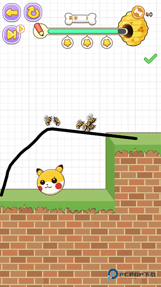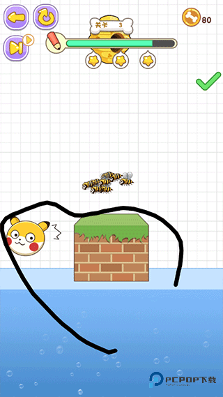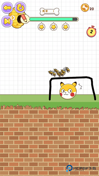 通关方法:画一个梯形的圈,将狗狗圈在里面,这样蜜蜂就蛰不到狗狗了。