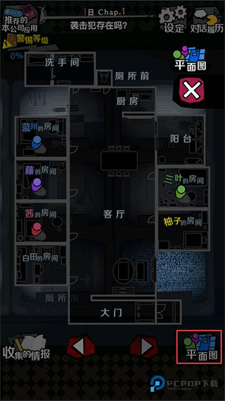 6、屏幕的右下方位置有一个平面图按钮,点击此按钮可以显示这个大套间内的所有房屋分布情况,可以帮助玩家更好的理解剧情和分析线索。