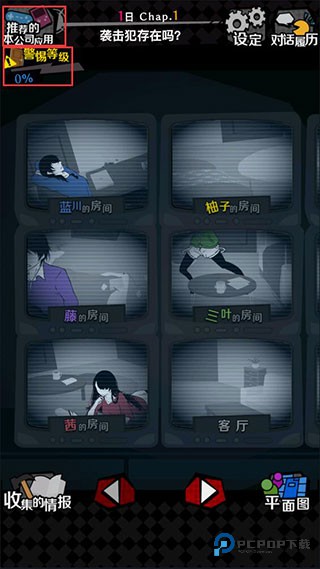 2、屏幕的左上角位置有两个按钮,一个是推荐的本公司应用,因为游戏已经是单机破解状态,所以无法显示详情。而另一个关系到游戏的主线剧情推进,警惕等级的数值越高,越代表室友对你的警惕和怀疑。